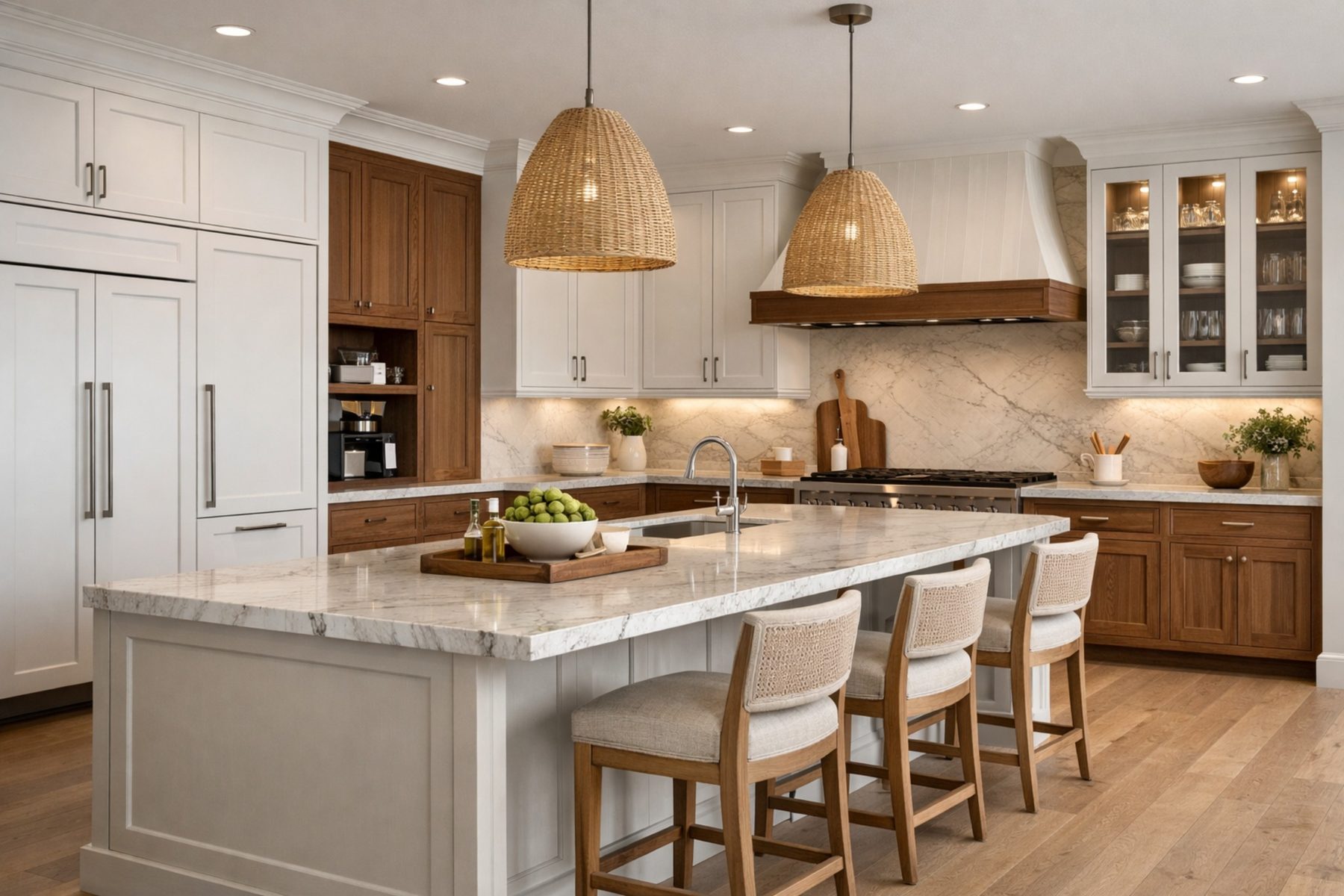 Wood tones, paint, stone, metals, and lighting should read as one disciplined composition, not a stack of disconnected choices.
