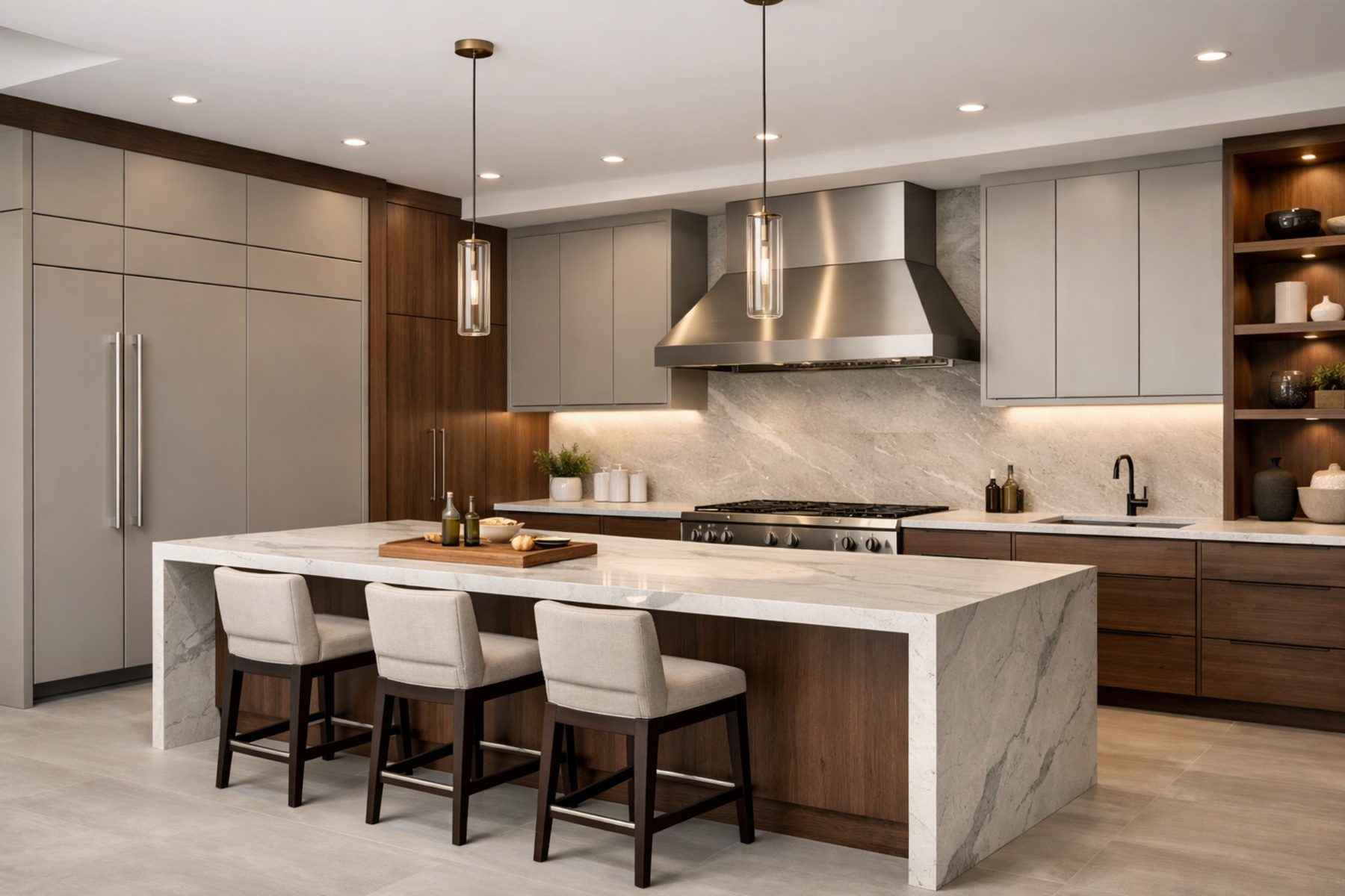 Island size, walkway clearance, appliance landing space, and prep flow are treated as design decisions, not afterthoughts.